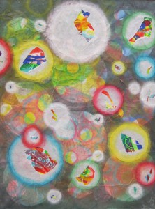 色彩の美しさを求めています。形は偶発的なものから見つけようとしています。その時の手が選ぶがままに色を出してみる。 眼前の画面に演じられる色彩と形、それがどう自分としっくりいくか?なかなか腑に落ちるということはないが・・・ 汎美展に出品するようになり、大きな作品にも取り組むようになった。大きなキャンバスに向かうとき、思い切り色をなぐりつけられる快感がたまらなくて、続けてきたように思う。創作というよりも遊びという感覚が強い。自由に描けることがうれしいし、自由に描きたいと思う。